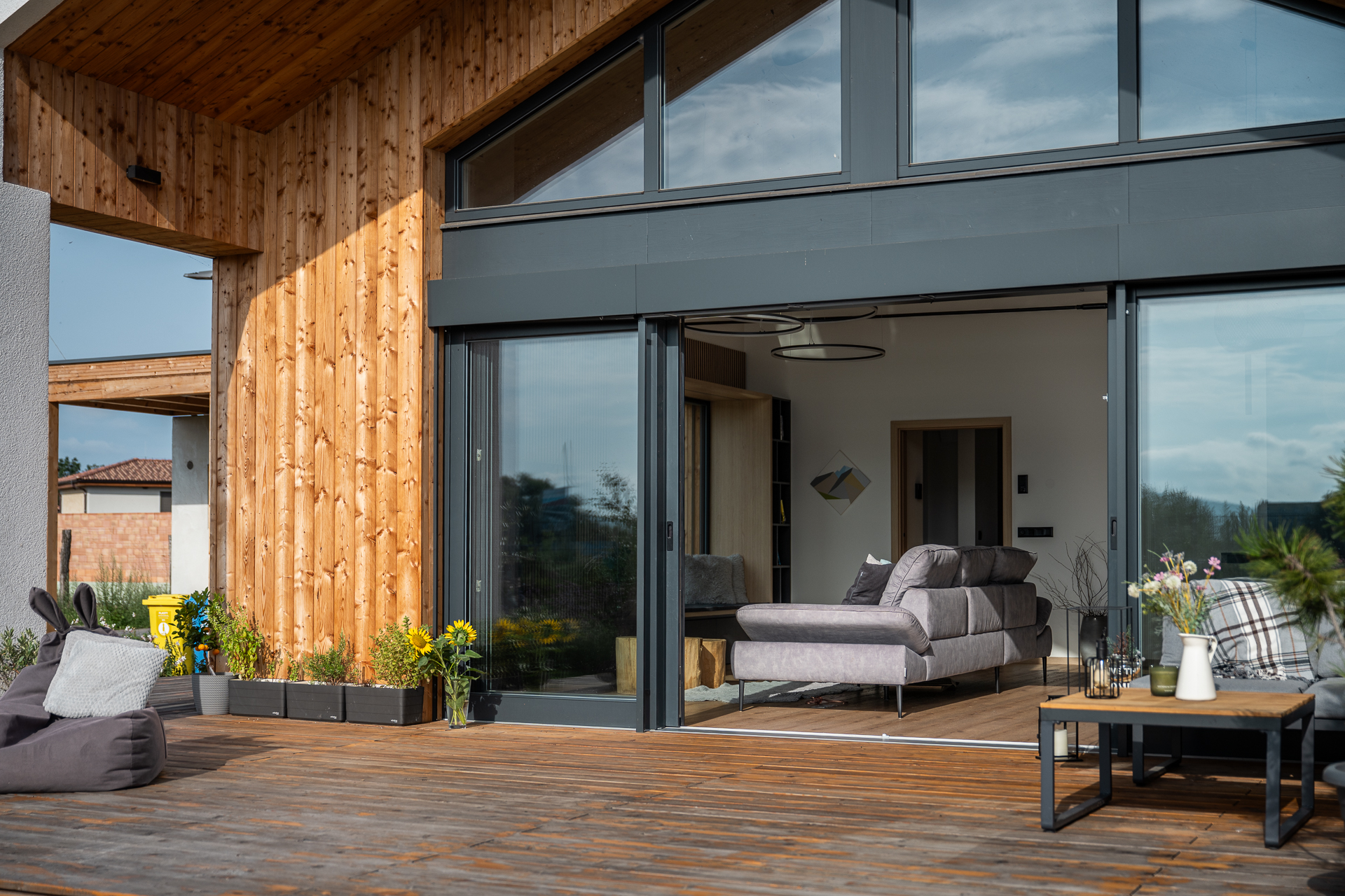 Propojení interiéru a exteriéru – dřevostavba s velkými okny a sedacím koutem