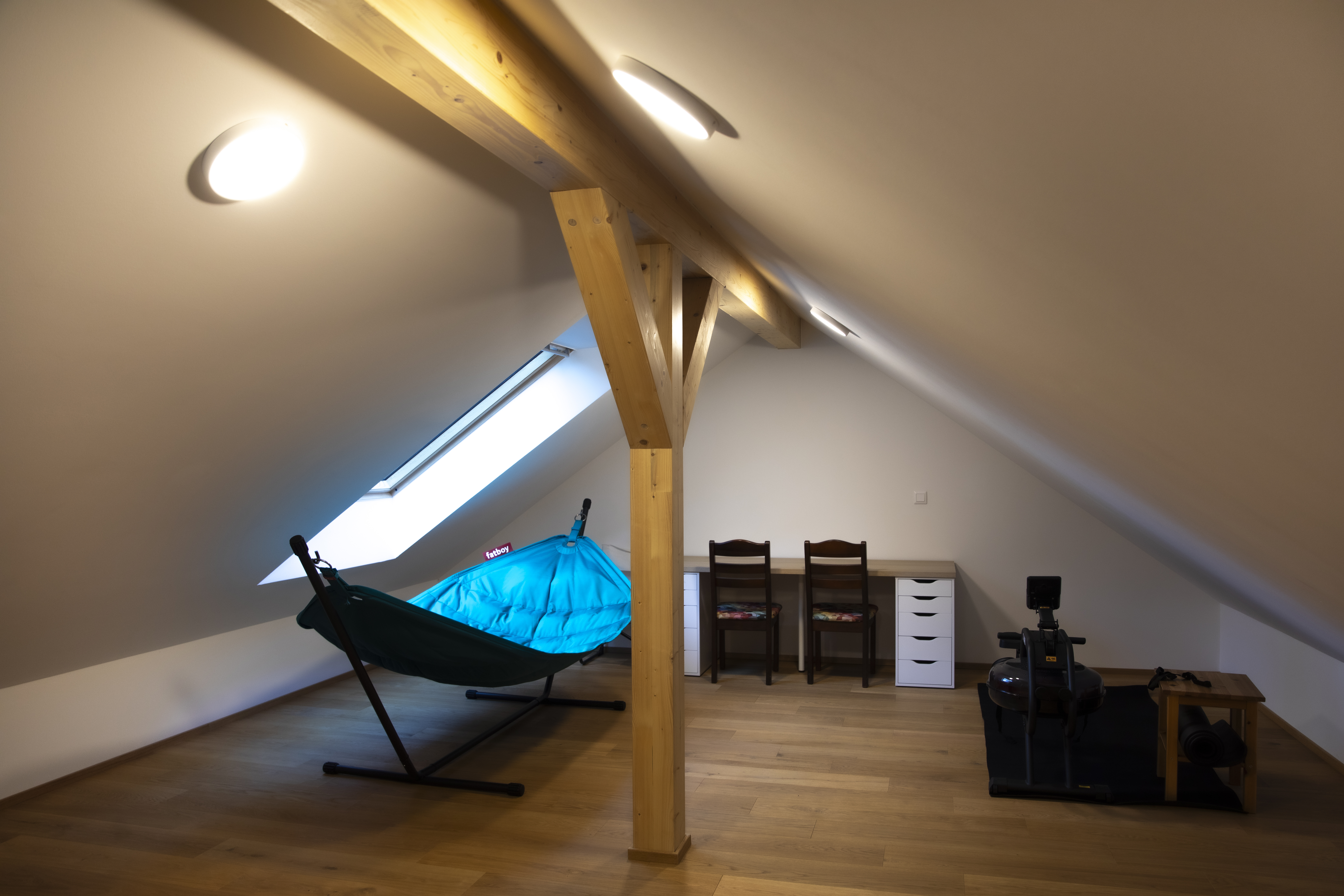 Dalším unikátním prvkem této dřevostavby je malá pracovna pod střechou. Tento klidný a inspirativní prostor je ideální pro práci i studium. Díky velkému střešnímu oknu zde majitel může nejen pracovat v klidu, ale také v létě obdivovat noční oblohu.