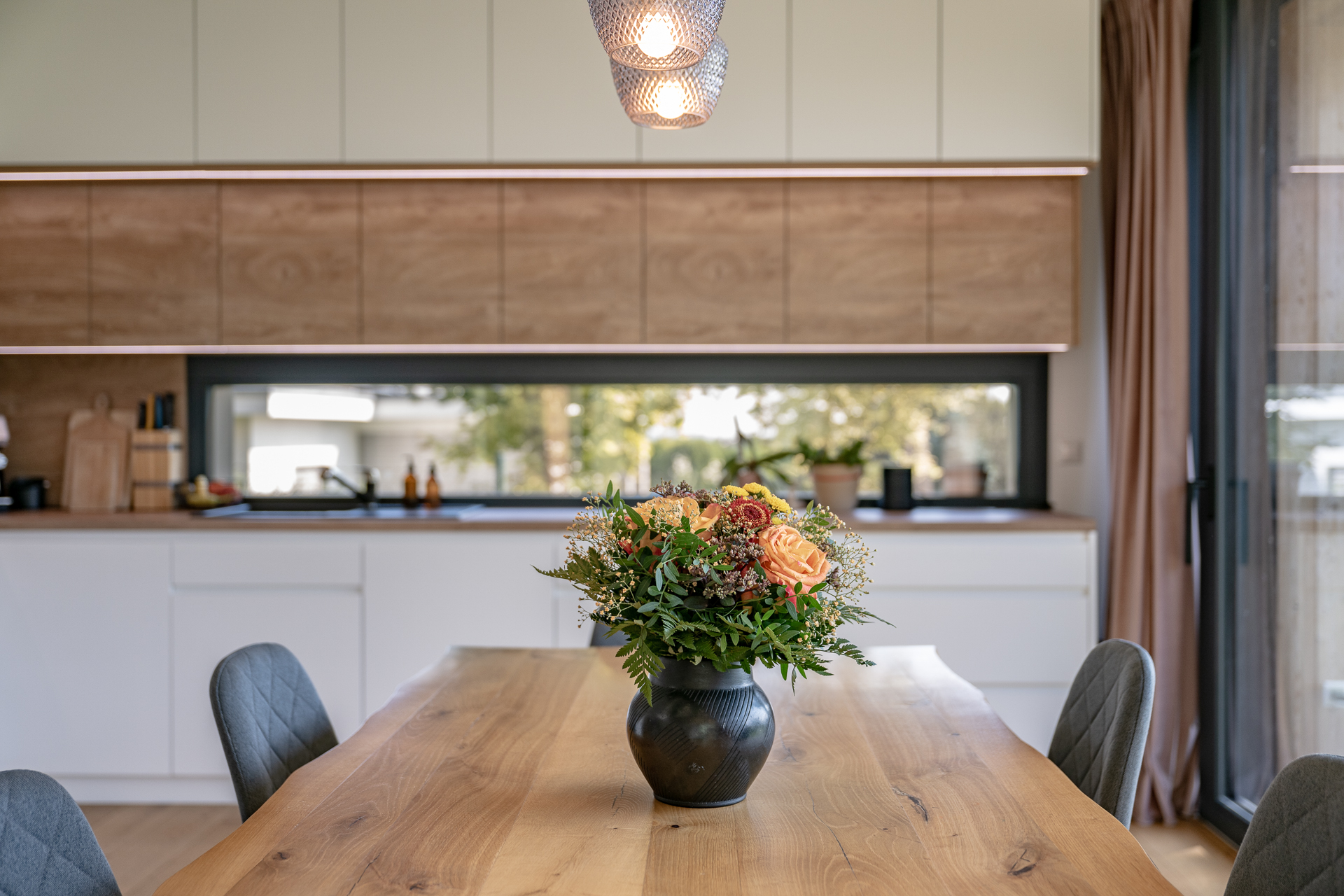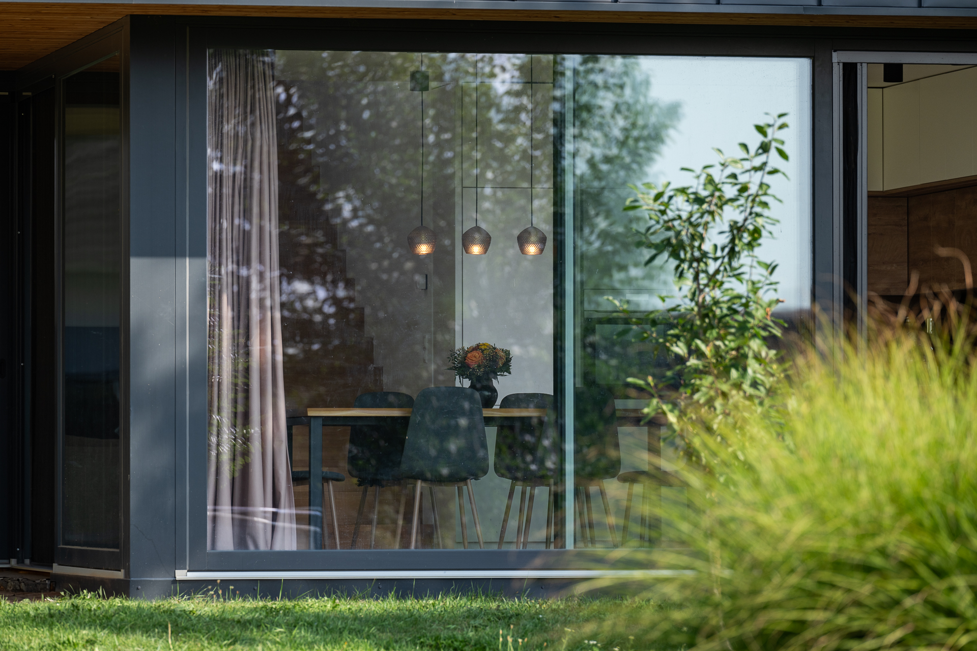 U domů s menším pozemkem je tento prvek zvlášť cenný – i když exteriér končí jen pár metrů od domu, velké prosklené plochy vytvoří dojem otevřeného prostoru a živého obrazu za okny.