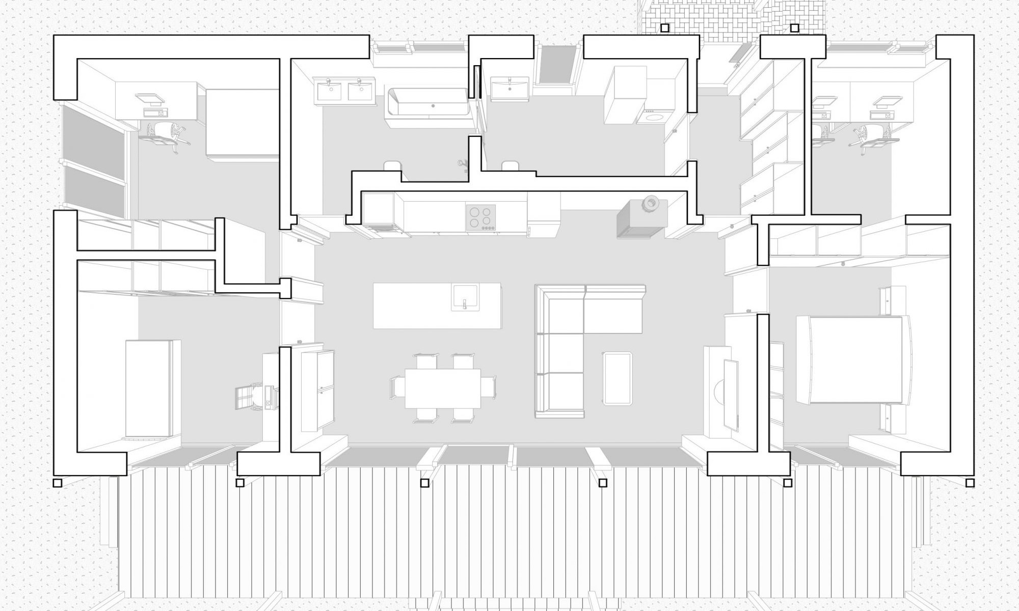 Hlavní devizou je vnitřní řešení bez zbytečných chodeb. Každý metr čtvereční tady má svůj smysl – žádný „hluchý“ prostor, žádné slepé uličky. Vše je navrženo s respektem k reálnému životu. ◾️ Střed domu tvoří velkorysý obývací pokoj s kuchyní – světlo, vzduch, společné chvíle. Z tohoto centrálního prostoru pak vede přímá cesta do jednotlivých pokojů, které tvoří soukromé zóny pro každého člena rodiny. Žádné dlouhé přechody – všechno je na dosah, a přesto s dostatečným odstupem.