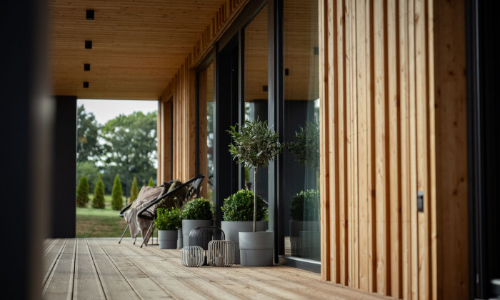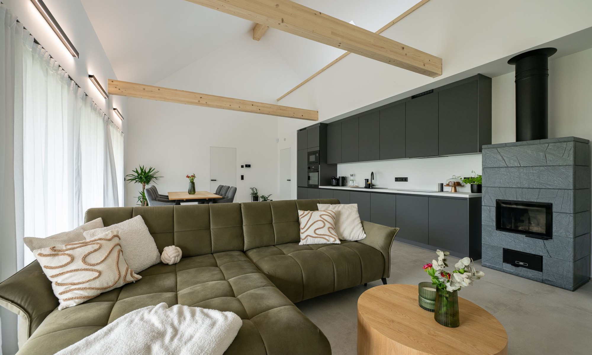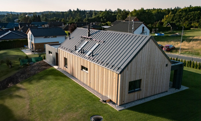 Moderní rodinný dům zaujme svým nadčasovým designem a efektivním vnitřním uspořádáním, kde každý metr čtvereční má svůj smysl.◾️ Exteriér domu zdobí plastická modřínová fasáda v kombinaci s odolným obkladem Hardie® Panel, což dodává domu moderní vzhled a trvanlivost vůči povětrnostním vlivům. ◾️ Středobodem domu je prostorný obývací pokoj propojený kuchyní, kde se setkávají každodenní rodinné aktivity.◾️ Otevřený prostor do krovu dodává interiéru vzdušnost, přísun horního světla zajišťují střešní okna Velux, napojené na systém chytré domácnosti.◾️Díky velkému HS portálu je zajištěn plynulý přechod na prostornou terasu, která je přímo napojena na garážové stání se zahradním domkem, čímž se rozšiřují možnosti využití venkovního prostředí. ◾️ Z centrálního prostoru vedou přímé cesty do jednotlivých pokojů, které nabízejí soukromé zóny pro každého člena rodiny. ◾️Moderní koupelna se pyšní velkoformátovými obklady a volně stojící vanou, což vytváří klidnou a harmonickou atmosféru.◾️ Dřevostavba je navržena s ohledem na skutečný život, kde žádný prostor není nevyužitý a všechny místnosti jsou snadno přístupné, a přesto poskytují dostatečný odstup pro soukromí.