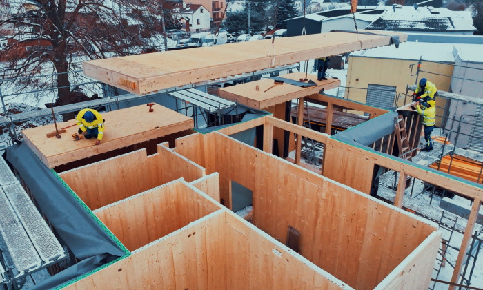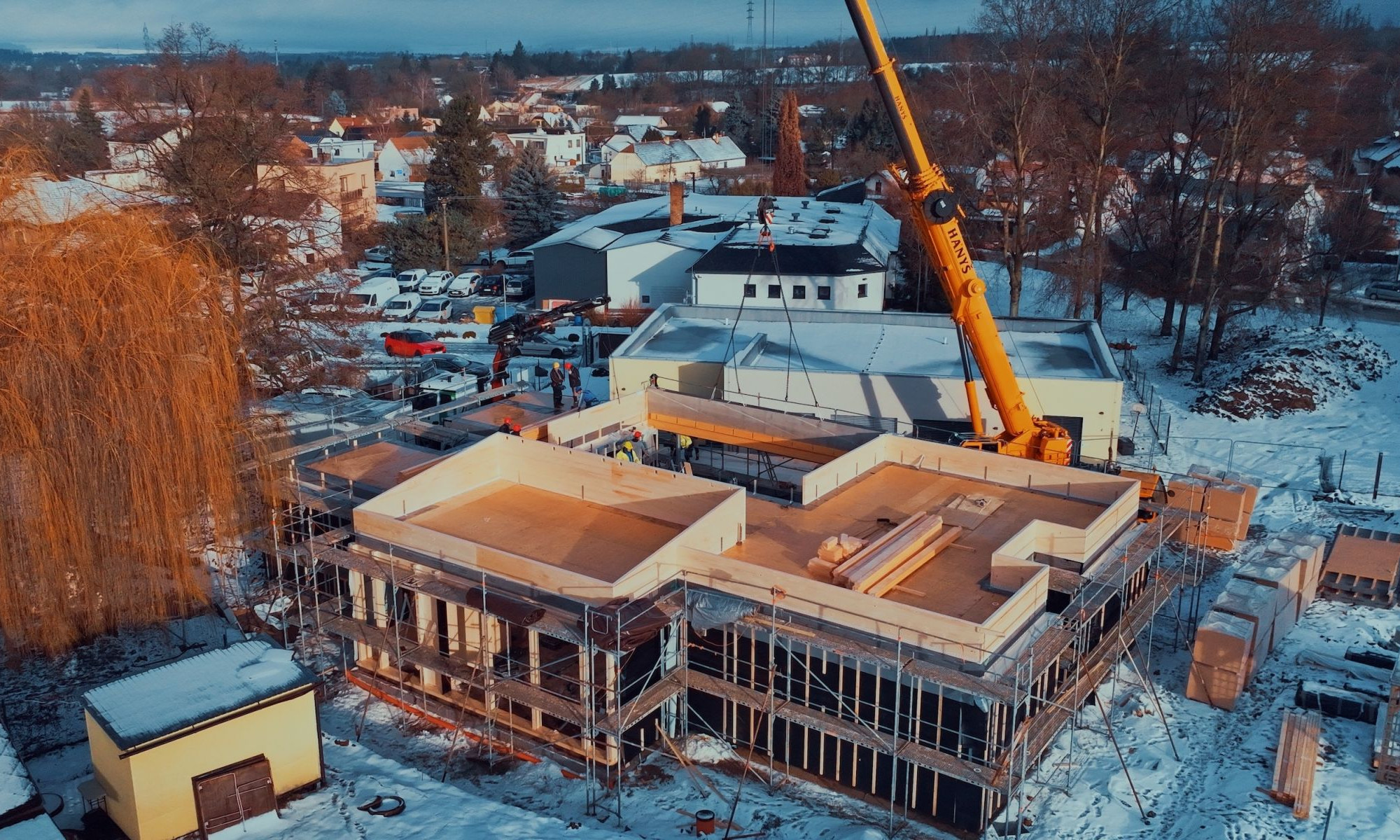 Dřevostavba kombinující ocelové prvky, prefabrikované CLT a sendvičové panely.